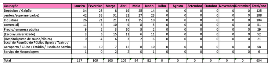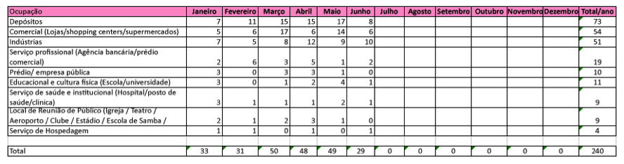 Dentre os incêndios estruturais, só não foram contabilizados os incidentes que aconteceram em residências. Também não foram incluídas informações sobre incêndios florestais. No total, foram encontradas notícias referentes a 634 incêndios, o que daria uma média de 105,6 ocorrências noticiadas por mês.