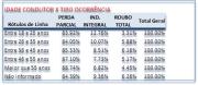 Indenização por faixa etária – Na análise por tipo de indenização (parcial e integral) por faixa etária, os jovens lideram as indenizações integrais dos veículos. Cerca de 12,8% das ocorrências com condutores entre 18 e 25 anos resultam em indenização total. O índice reduz de acordo com o avanço da idade. Por exemplo, os condutores de 26 e 35 anos ocupam a segunda posição com 10,1%; aqueles entre 36 e 45 representam 8,5% e os de 46 a 55 anos 7,7%. Com motoristas acima de 55 anos a indenização integral cai para 6,8%.