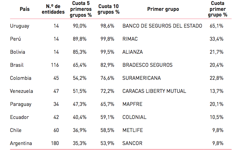 O mercado segurador da região continua concentrado. No Brasil, com 116 companhias, os cinco primeiros grupos dominam 65% das vendas e os dez primeiros 82%. A Bradesco é a líder, com market share de 20,4% em 2012. No entanto, outros países revelam maior concentração. O Uruguai, com apenas 14 seguradoras, tem o maior percentual de concentração, com as cinco maiores detendo 90%, e a Argentina, com 180 companhias, tem a menor taxa de concentração de vendas, com as cinco maiores detendo 35% das vendas.