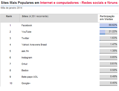 Em sexto lugar no ranking de janeiro de 2014 ficou o Instagram (0,65%), seguido de Orkut (0,61%), Badoo (0,58%), Bate-papo UOL (0,49%) e Google+ (0,45%).
