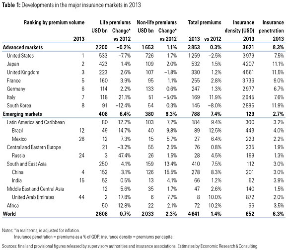 Apesar de um crescimento menor que o registrado em 2012, de 2,7%, o estudo da Swiss Re mostra que o mercado global de seguros não-vida avançou 2,3% em 2013, aos US$ 2,033 trilhões. Nos mercados emergentes, o crescimento dos prêmios não-vida manteve-se forte em 8,3%, depois de 9,3% em 2012. E a solidez foi observada em todas as regiões, com exceção da Europa Oriental e Central. A expansão na Ásia emergente foi apoiada por um forte crescimento na China (15,5%). Na índia, no entanto, depois do aumento de 8,9% em 2012, o crescimento das vendas desacelerou para 4,1%, devido a uma economia mais lenta. No Brasil, as vendas de seguros não-vida subiram 9,8% em 2013.