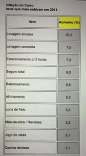 E se não fosse a crise de abastecimento de água em São Paulo o índice poderia ser menor. É que a falta d’água provocou o fechamento de muitos lava-rápidos e elevou os preços da lavagem do carro. Mesmo sendo um item que não tem muito peso na composição da Inflação do Carro, a lavagem pesou no índice final porque teve um aumento expressivo no ano. O preço da lavagem completa subiu 7,5% e a lavagem simples teve uma alta de 20,1%. Foram os dois itens que mais subiram em 2014.