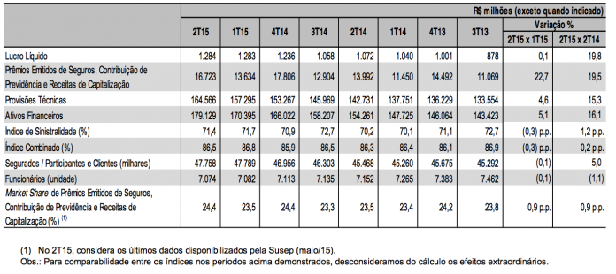 O lucro líquido ajustado do 1o semestre de 2015 foi de R$ 8,7 bilhões, 20,6% acima do resultado de R$ 7,2 bilhões no mesmo período de 2014, correspondendo a R$ 3,35 por ação, e rentabilidade de 21,9% sobre o Patrimônio Líquido Médio Ajustado. Quanto à origem, o ganho é composto por R$ 6,2 bilhões provenientes das atividades financeiras, correspondendo a 70,8% do total, e por R$ 2,5 bilhões gerados pelas atividades de seguros, previdência e capitalização, representando 29,2% do total.