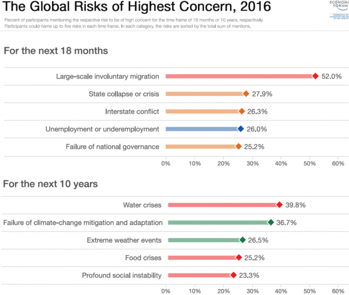 Captura de Tela 2016-01-15 às 15.23.53Mudança climática é pela primeira vez o maior risco global do ranking do estudo Global Risks, conduzido e divulgado pelo World Economic Forum. Embora no curto prazo (18 meses) a maior preocupação (52%) seja com a imigração, no longo prazo (10 anos) o topo da lista é ocupado por temas ambientais: crise hídrica (39,8%), fracasso na mitigação e adaptação às mudanças climáticas (36,7%) e eventos climáticos extremos (26,5%).