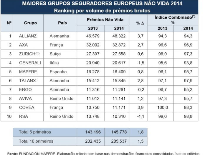 Foi neste contexto que atuaram os 10 grandes grupos seguradores europeus de Não Vida em 2014, com desigual comportamento no que se refere ao faturamento, alcançando conjuntamente um volume de prêmios de 205,537 bilhões de euros, que representa um aumento de 1,5% em relação a 2013. Sete grupos cresceram em relação ao exercício anterior e três mostraram decréscimos nos prêmios.