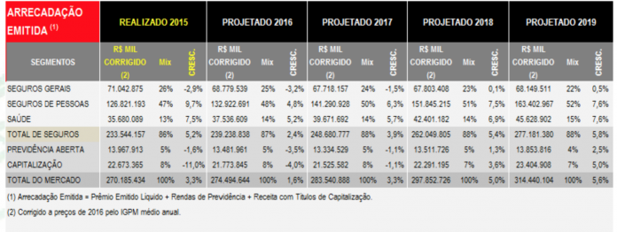 As projeções dos seguros de pessoas, incluindo VGBL e seguro saúde, consideram crescimento real de 4,9% em 2016, menos do que os 9,2% em 2015. A recuperação se dará nos anos seguintes, chegando a 2019 ao indicador de 7,6%.
