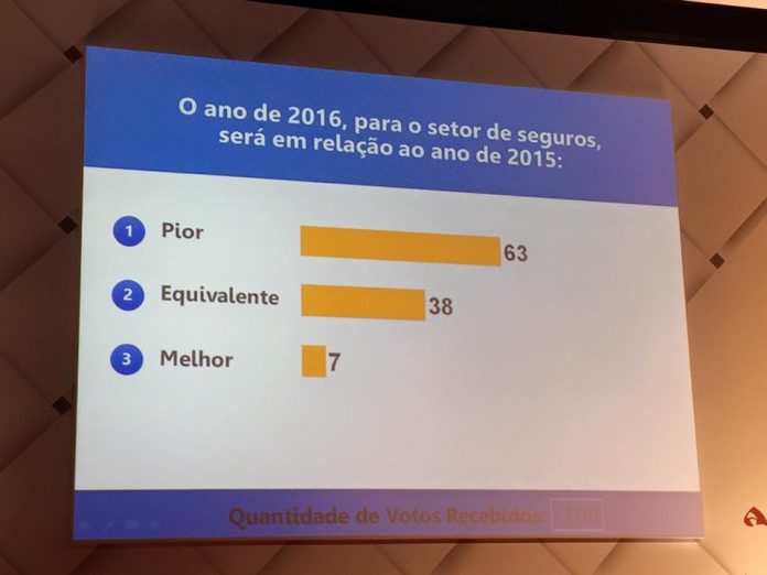2016 realmente será um ano desafiador para todos, inclusive para o mercado segurador, segundo revelou pesquisa realizada com os participantes do 21o Encontro de líderes promovido pela CNseg na Praia do Forte (BA), entre os das 25 e 28 de fevereiro. Cerca de 63% afirmaram que 2016 será um ano pior do que 2015, 38% que será equivalente e 7% deles escolherem a opção “será melhor”.