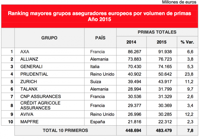A AXA se manteve na liderança do ranking de maiores seguradoras da Europa, segundo estudo divulgado pela Fundacion Mapfre nesta quinta-feira, com prêmios totais de 91,9 bilhões de euros em 2015, avanço de 6,6%. O ranking traz Allianz, Generali, Prudential, Zurich, Talanx, CNP, Credit Agricole, Aviva e Mapfre. As dez maiores segurdoras europeias registraram prêmios de 483,4 bilhões de euros em 2015, crescimento de 7,8% em relação ao ano anterior. O segmento Não Vida foi responsável por 217 bilhões de euros, liderado por Allianz, AXA e Zurich. No quesito margem de solvencia, a Mapfre é a líder do ranking, seguida por Prudential, AXA, Aviva e Talanx.
