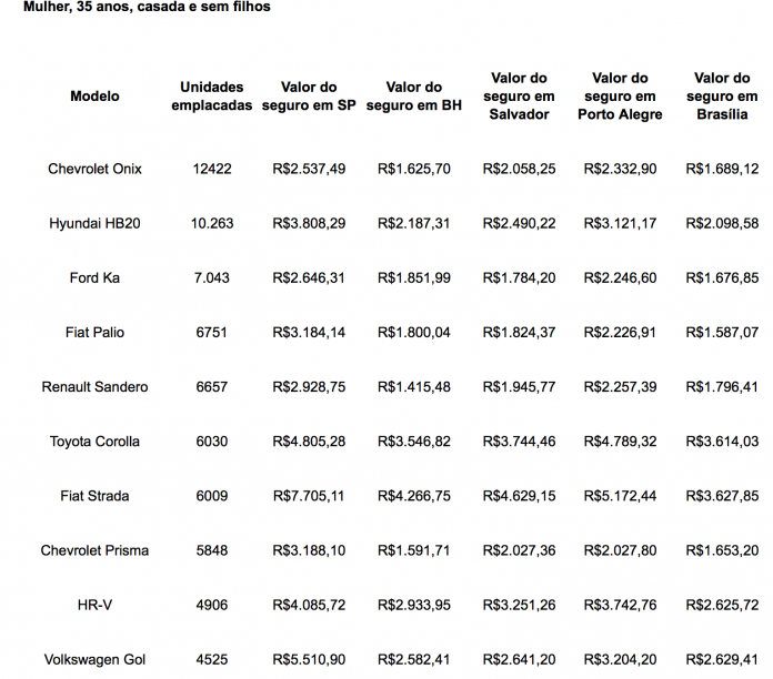 Mas para quem quer manter o conforto do carro, a Bidu Corretora realizou um levantamento que aponta o valor do seguro dos dez modelos mais emplacados no mês. Para a cotação, foram utilizados dois perfis fictícios: o de um homem de 35 anos, casado e sem filhos e o de uma mulher de 35 anos, casada e sem filhos. As cotações foram realizadas em cinco capitais brasileiras.