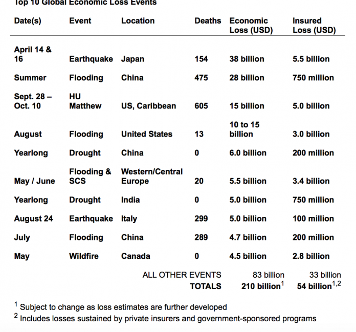 315 eventos de catástrofes naturais ocorreram em 2016 e geraram perdas econômicas de US$ 210 bilhões. Para o contexto histórico, 2016 foi o sétimo ano com custos mais elevados, com a perda econômica combinada ultrapassando US$ 200 bilhões pela primeira vez desde 2013.