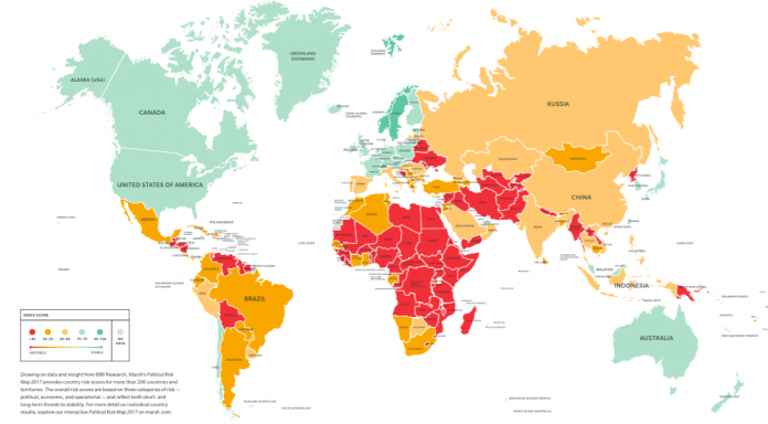 As tensões geopolíticas, incertezas nas economias emergentes, aumento do protecionismo e o terrorismo estão entre os maiores riscos paras as empresas e investidores, segundo a mais recente edição do Mapa de Risco Político da consultoria de risco e corretora de seguros Marsh, produzido em parceria com a BMI Research. As duas empresas analisaram e classificaram mais de 200 países, com base nos seus riscos políticos, econômicos e operacionais, que refletem na estabilidade dos países a curto e longo prazo.