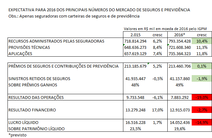 O resultado dos prêmios mais contribuições, após as parcelas destinadas ao resseguro e as provisões técnicas, apresentará em 2016 um decréscimo de 4,3% sobre 2015 (+1,6% em 2015/2014). Os sinistros de seguros deverão manter, praticamente, os mesmos patamares de 2015.