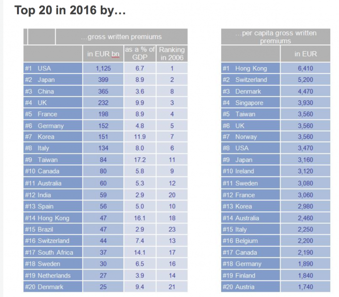 O Brasil é o 15o maior mercado de seguros do mundo no ranking do estudo da Allianz, com 47 bilhões de euros em 2016. O ranking é liderado pelos Estados Unidos, com 1,125 trilhão de euros em prêmios, pelo Japão, com 399 bilhões de euros, e pela China, com 365 bilhões de euros. Em participação do setor do PIB, o Brasil despenca no ranking, com apenas 2,9%. China também exibe ainda um tímido percentual: 3,6%. Uma referencia para os estudiosos é a penetração dos Estados Unidos: 6,7%.