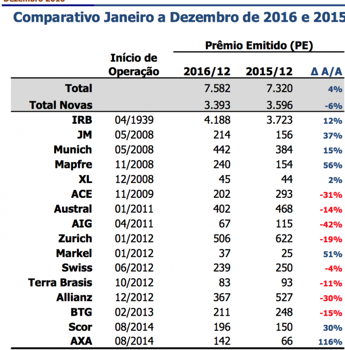 A Terra Brasis divulgou uma prévia do estudo de resseguros referente aos dados consolidados de 2016. O volume de resseguro cedido pelas seguradoras brasileiras (bruto de comissão) foi de R$ 10,17 bilhões, sendo R$ 7,39 bilhões colocados nas resseguradoras locais (perto de 73%), praticamente estáveis em relação a 2015.