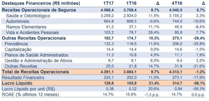 As operações de seguro saúde e odontológico foram destacadas pelo executivo, com índice de sinistralidade para um primeiro trimestre citado como o melhor desde 2010. Os planos odontológicos continuaram apresentando desempenho relevante tanto em receitas quanto em número de membros segurados, com aumentos de 22,9% e 15,0%, respectivamente, em relação ao 1T16. O segmento de saúde e odontológico registraram receitas operacionais crescendo 11,5% na comparação com o primeiro trimestre de 2016, alcançando R$ 3,3 bilhões, consolidando a seguradora como uma das maiores operadoras de saúde suplementar do Brasil. Os destaques foram os planos coletivos, com importante aumento nas modalidades PME (+16,2%) e odontológico (+22,9%).