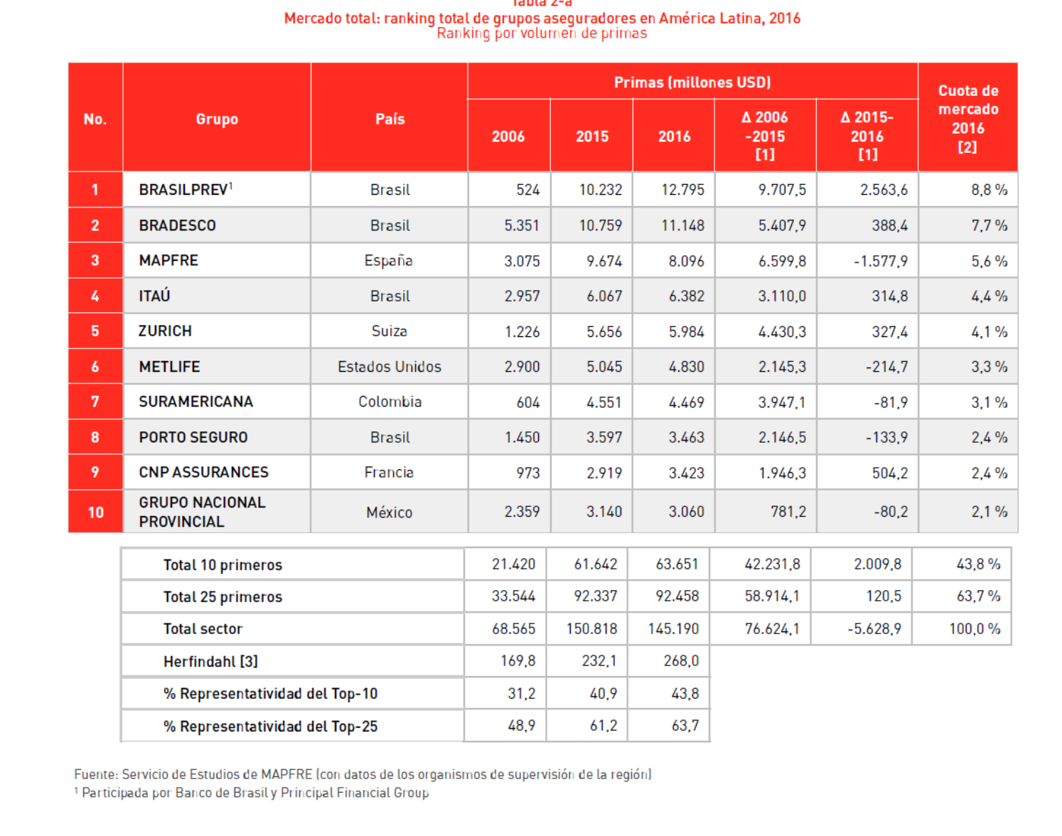 O setor de seguros na América Latina contraiu 3,7% em 2016, pelo efeito da desvalorização da maioria das moedas regionais. O volume de negócios total do setor atingiu US$ 145,2 bilhões, traz o estudo anual publicado pela Fundação Mapfre sobre o mercado de seguros da América Latina. O relatório mostra, no entanto, que com a análise concentrada nos dez principais grupos de seguros na região, acumulando 44% da receita do mercado, a comparação com o ano anterior mostra um aumento nos negócios de 3%.