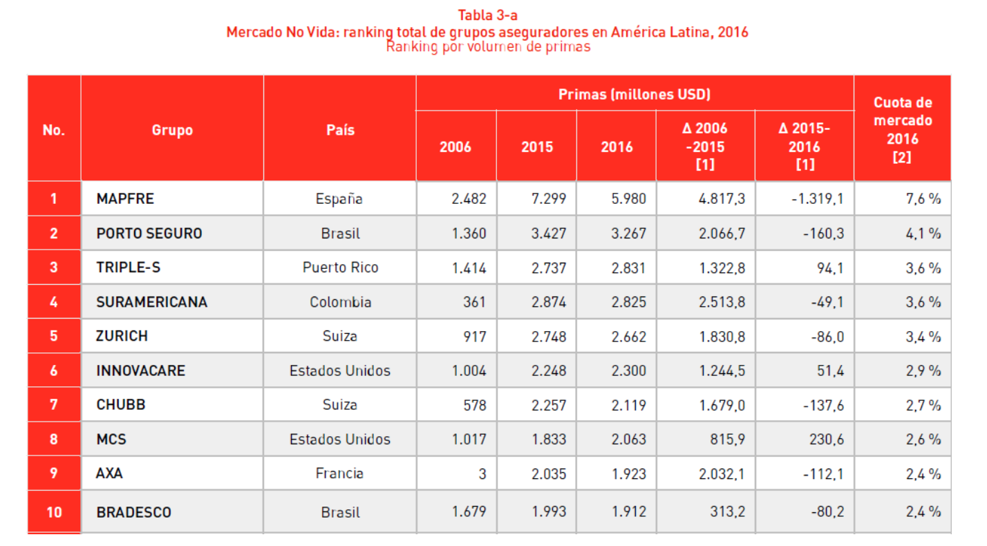 No ramo Seguros Gerais, o volume de prêmios na América Latina alcançou US$ 78,7 bilhões, 11,3% menos do que no ano anterior. O declínio tem como consequência a desvalorização cambial na maioria das moedas latino-americanas em 2016. Os 25 maiores grupos seguradores do setor não-vida na América Latina acumulam 60% dos prêmios em 2016. O ranking continua liderado pela Mapfre, com market share de 7,6% em 2016, quase o dobro da Porto Seguros, com 4,1%.