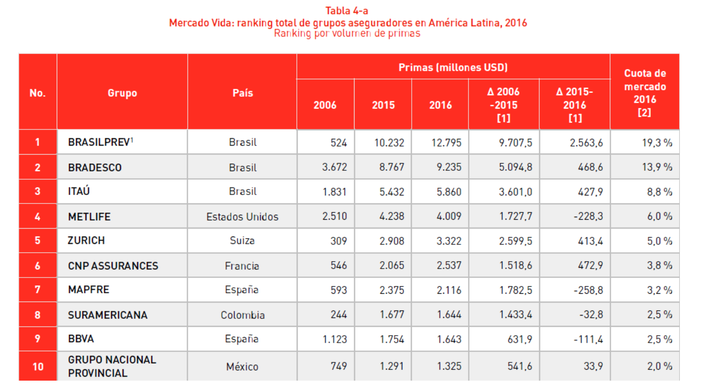 O crescimento do seguro de vida no mercado brasileiro crescer de forma significativa de 2002, quando começou a ser comercializado o Vida Gerador de Benefício Livre (VGBL), um produto de plano privado de previdência complementar. Este seguro, que é distribuído principalmente através do canal bancário, em 2016 alcançou um volume de prêmios superior a US$ 30 bilhões, o que representa 45% do segmento total de prêmios do ramo vida no mercado latino-americano. O primeiro lugar é ocupado pela Brasilprev, empresa de previdência privada do Banco do Brasil e Principal Financial Group. Bradesco ocupa a segunda posição, seguida pela espanhola Mapfre.