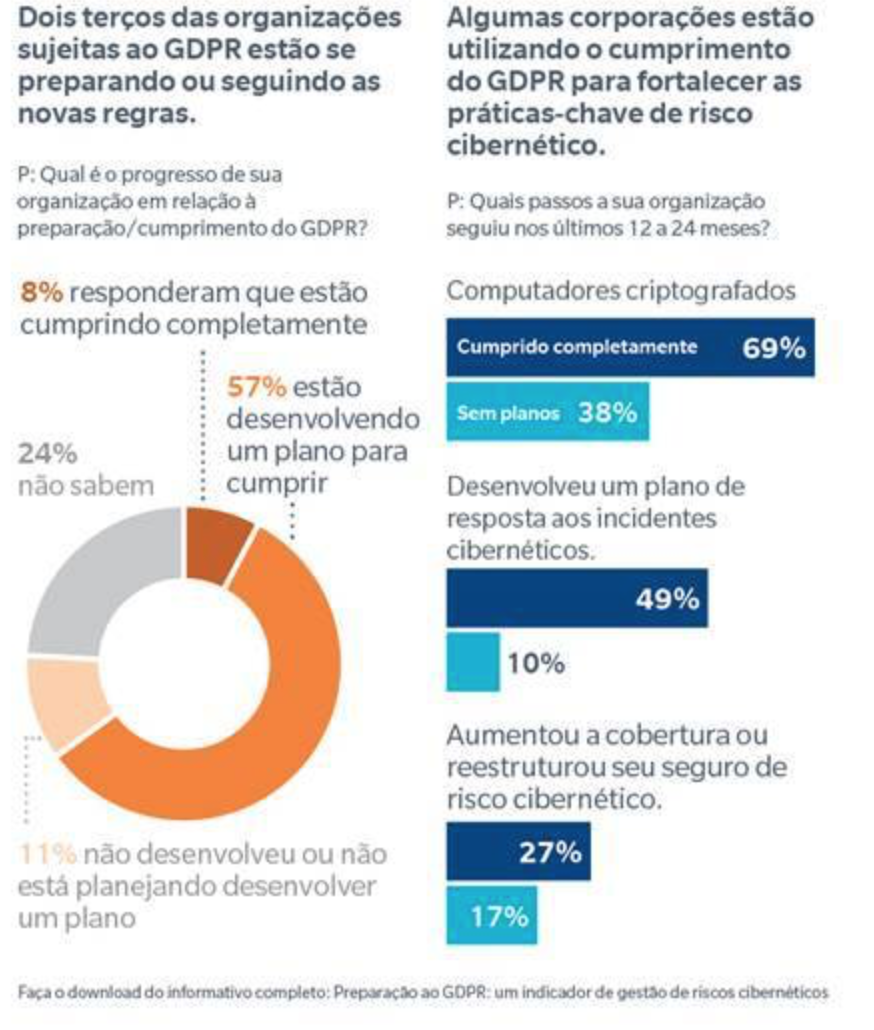 “A implementação iminente do GDPR está forçando empresas a olharem novamente para seus riscos cibernéticos, não somente para suas políticas e protocolos de segurança”, disse John Drzik, Presidente para Riscos Globais & Digital na Marsh. “Esta pesquisa indica que as empresas mais preparadas estão fazendo uso do GDPR para alavancar sua gestão dos riscos cibernéticos, com uma avaliação econômica de seu programa e um foco maior em resiliência”.