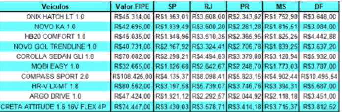 Dos locais avaliados, o Distrito Federal é o que possui o seguro mais caro para 80% dos carros analisados. Por outro lado, Campo Grande é a capital que apresenta os preços mais baixos para cinco dos dez automóveis listados abaixo. São Paulo fica atrás com 4 veículos: