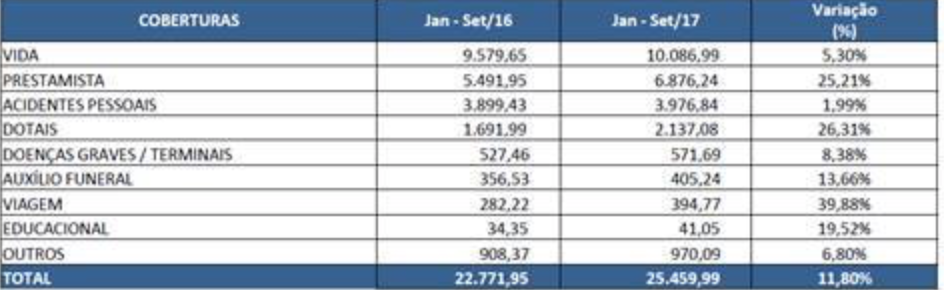 O mercado de seguros de pessoas, que inclui seguros de vida, de acidentes pessoais, viagem, educacional, entre outras modalidades de proteção, registrou no acumulado de janeiro a setembro R$ 25,4 bilhões em vendas, alta de 11,8% em relação aos R$ 22,7 bilhões dos noves meses de 2016. No terceiro trimestre deste ano R$ 8,7 bilhões em prêmios. O valor, que se refere às contratações de coberturas para riscos pessoais, é 13,44% superior ao total de R$ 7,43 bilhões movimentado no terceiro trimestre de 2016, segundo dados do balanço da FenaPrevi (Federação Nacional de Previdência Privada e Vida), que representa 68 seguradoras e entidades abertas de previdência complementar no país.