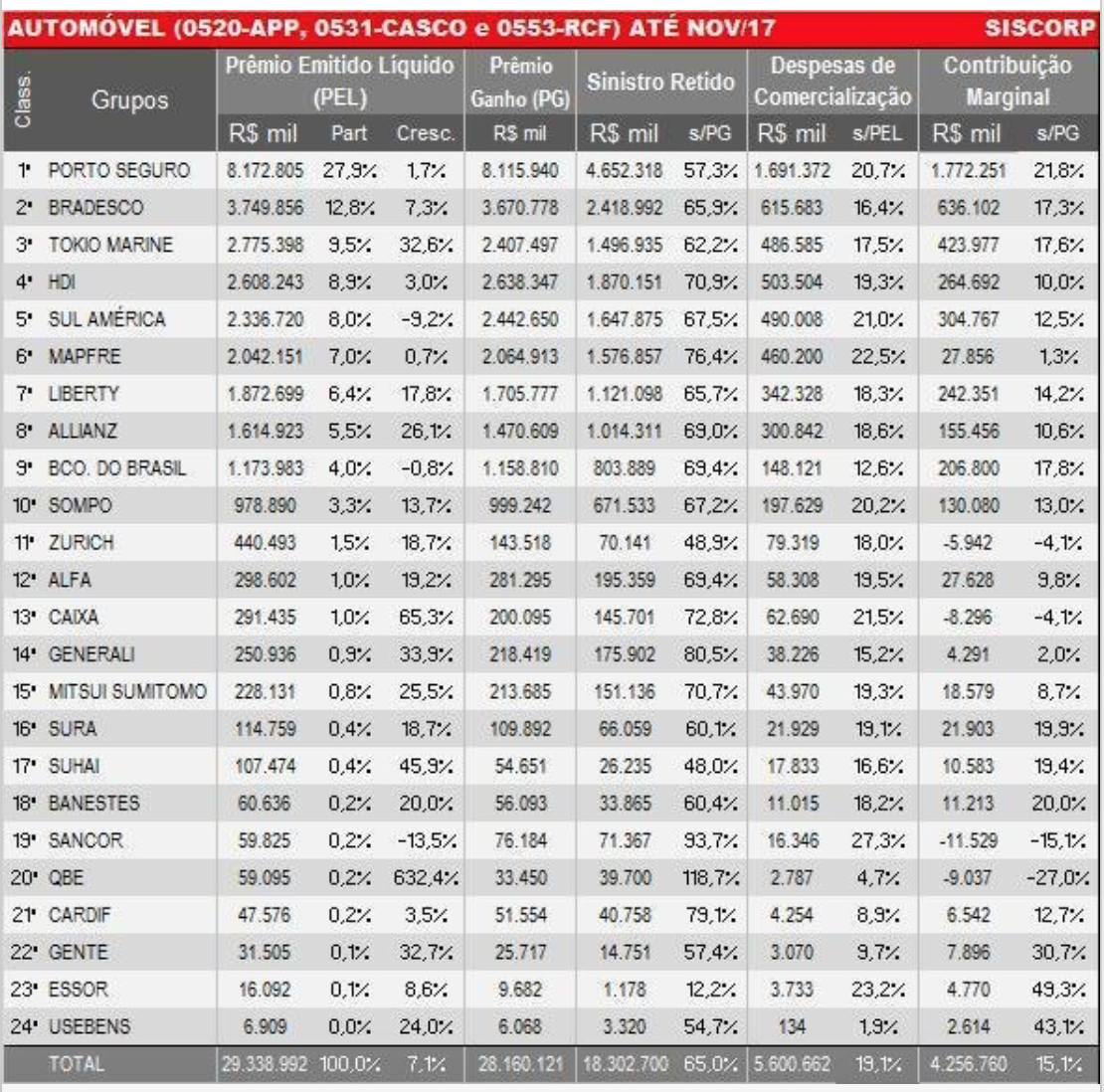 O ranking das maiores seguradoras de automóvel de 2017 deve apresentar uma nova configuração quando os dados de dezembro forem divulgados, o que está previsto para o início de fevereiro. De janeiro a novembro de 2017, dados divulgados nesta semana pela Superintendência de Seguros Privados (Susep), agrupados pela consultoria Siscorp, mostra que o segmento registrou vendas de R$ 29,3 bilhões, crescimento de 7,1% comparado ao mesmo período do ano anterior.