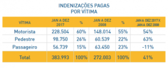 De acordo com a Organização Mundial da Saúde (OMS), o Brasil ocupa o quinto lugar no ranking de países com maior índice de acidentes de trânsito em todo o mundo. No ano de 2017, as indenizações pagas registraram aumento de 41% em relação ao ano de 2008. Outro número relevante é o de pedestres que aparecem em segundo lugar nas indenizações por acidentes fatais, sendo 26% em 2017 e 22% em 2008: