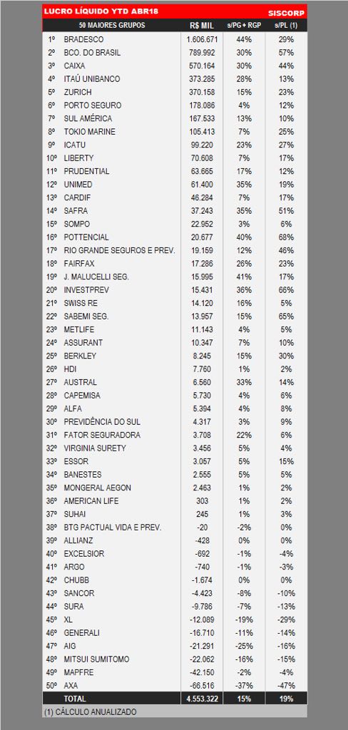 Apesar da queda da taxa básica de juros, o lucro líquido do mercado segurador apresentou ligeira alta no acumulado de janeiro a abril de 2018 comparado ao mesmo período de 2017. Segundo dados divulgados pela Superintendência de Seguros Privados (Susep), analisados pela consultoria Siscorp, o setor registrou lucro líquido de R$ 4,55 bilhões nos quatro primeiros meses deste ano, acima dos R$ 4,4 bilhões do mesmo período de 2017.