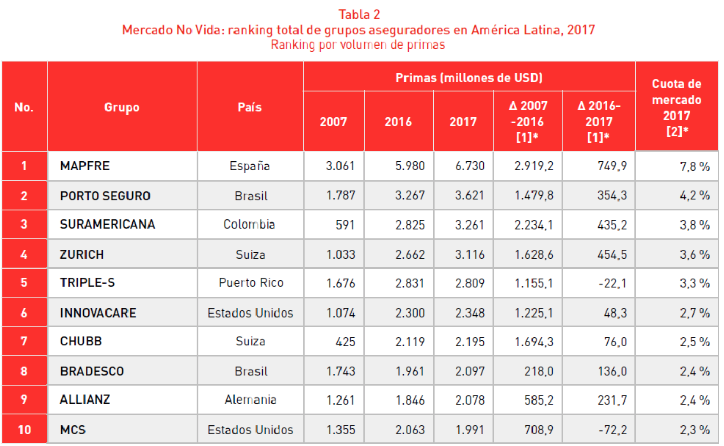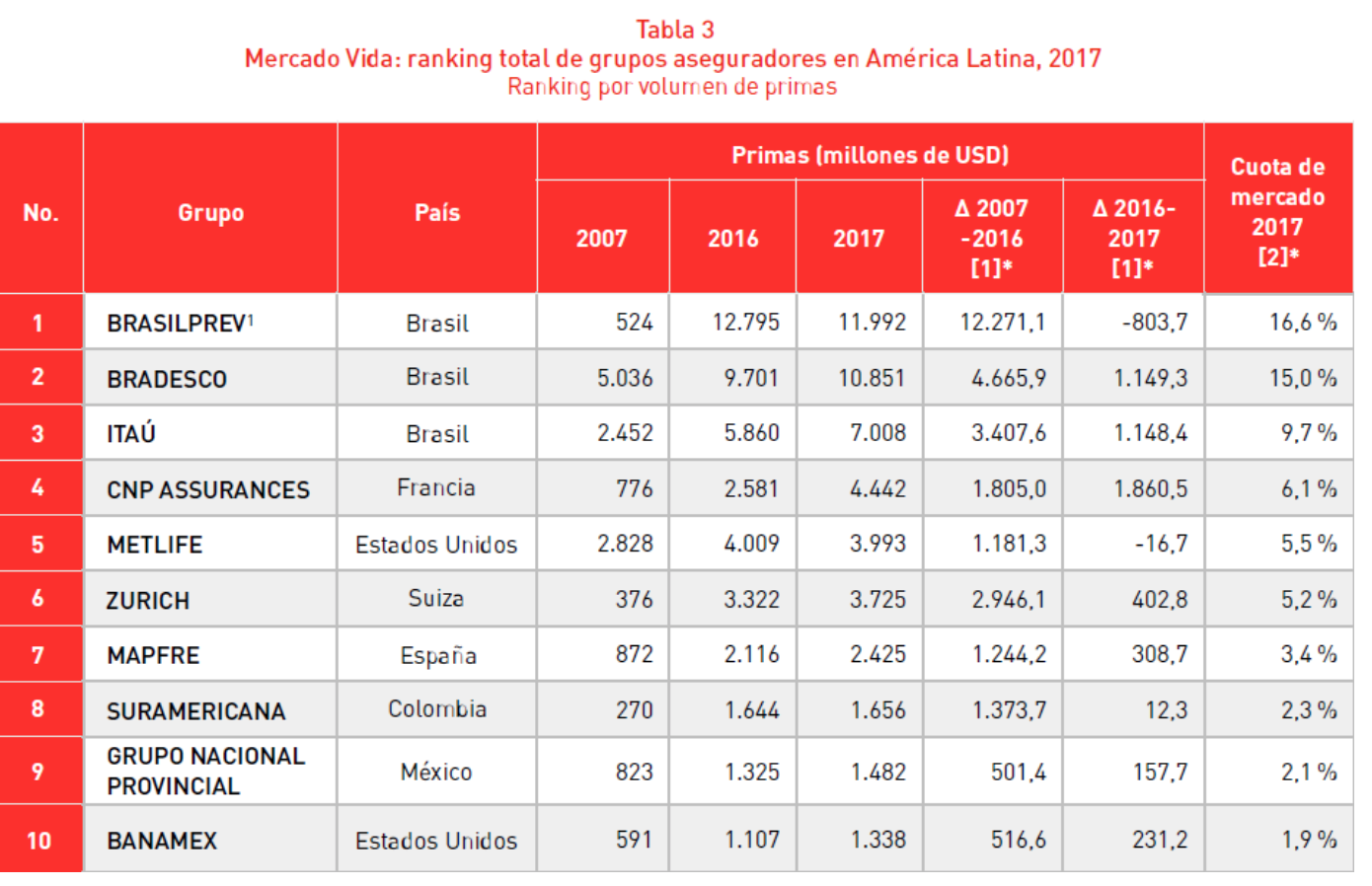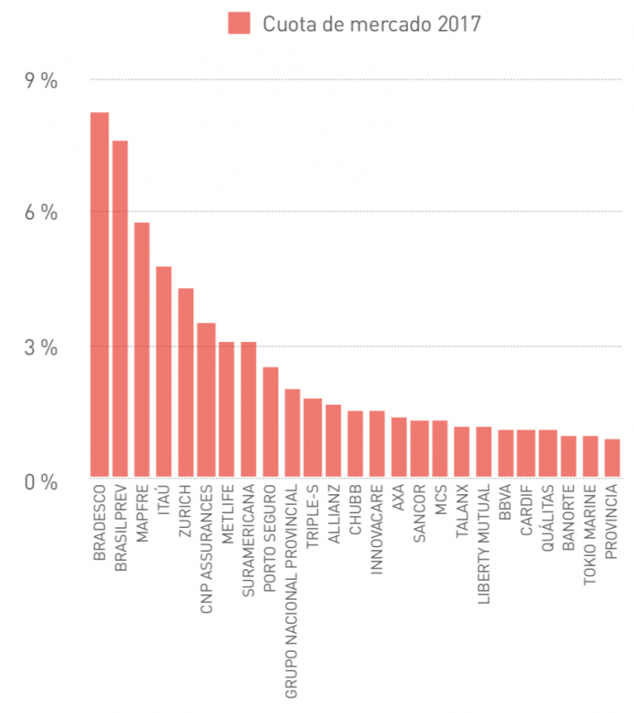 A Bradesco Seguros lidera a classificação dos grupos de seguros que operam na América Latina em 2017, com uma participação de 8,2%, seguido por Brasilprev (7,6%) e Mapfre (5,8%). Em relação a 2016, a Brasilprev perdeu 1,2 ponto percentual de parte pela queda na receita de prêmios, enquanto a quota de mercado Bradesco e Mapfre ganhou de 0,5 e 0,2 pontos percentuais, respectivamente.