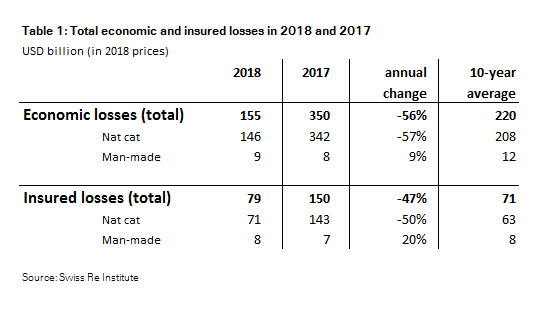 As perdas econômicas totais de catástrofes naturais e provocadas pelo homem em 2018 caíram para US$ 155 bilhões, praticamente a metade dos US$ 350 bilhões registrados em 2017. As perdas seguradas globais estão estimadas em cerca de US$ 79 bilhões, acima da média anual do ano anterior. Catástrofes naturais causaram perdas de US$ 146 bilhões e desastres provocados pelo homem de US$ 9 bilhões.