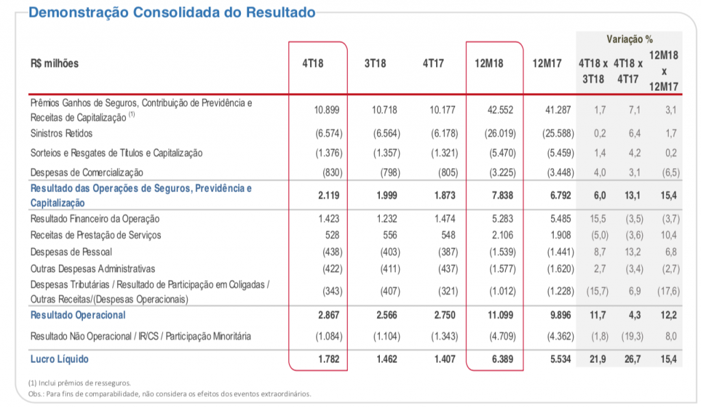O lucro líquido das operações de seguros, previdência e capitalização apresentou evolução de 15,4%, passando de R$ 6,7 bilhões em 2017 para R$ 7,8 bilhões no ano passado. Isso representa 29,6% do lucro divulgado pelo banco, de R$ 21,5 bilhões.