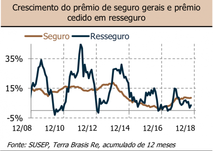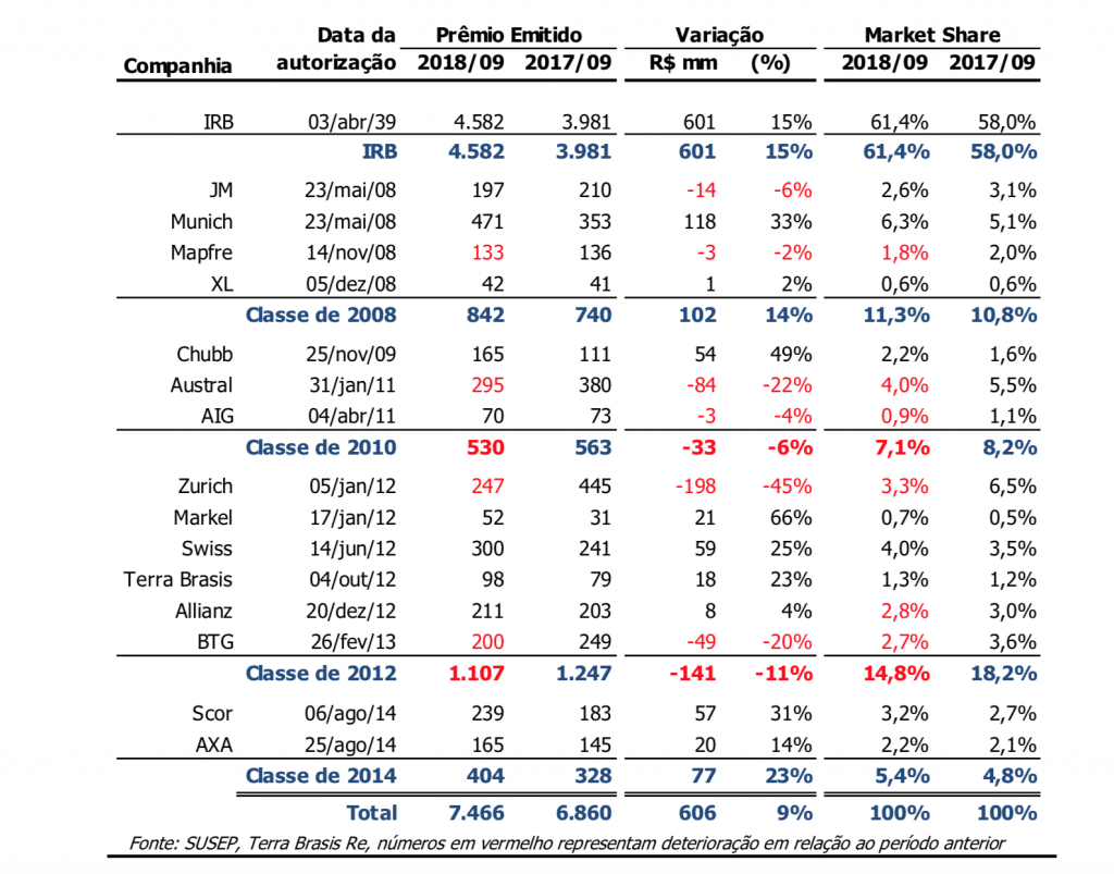 Em 2018 até setembro, resseguradoras locais receberam 70% do prêmio cedido por seguradoras brasileiras, frente a 73% do período equivalente em 2017. Acreditamos que este percentual poderá cair ainda mais durante 2019.