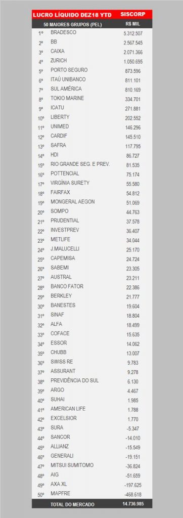 O mercado segurador encerrou 2018 com lucro líquido de R$ 14,7 bilhões, segundo dados compilados da Superintendência de Seguros Privados (Susep) pela consultoria Siscorp, divulgados nesta segunda-feira. Mesmo com a queda da taxa básica de juros, a Selic, o valor ficou acima dos R$ 13,3 bilhões registrados em 2017. Tendo em vista que as receitas com prêmios de seguros (inclui VGBL) recuaram de R$ 201 bilhões para R$ 207 bilhões no ano passado, fica claro o esforço das seguradoras em obter ganhos operacionais. Esse valor não considera saúde, capitalização, previdência tradicional e PGB, ressalta a Siscorp.