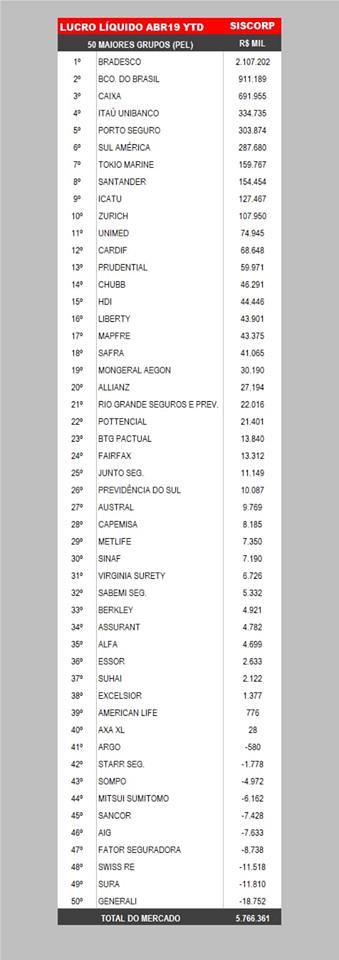 O lucro líquido do mercado segurador apresentou alta no acumulado de janeiro a abril de 2019 comparado ao mesmo período de 2018. Segundo dados divulgados pela Superintendência de Seguros Privados (Susep), analisados pela consultoria Siscorp, o setor registrou lucro líquido de R$ 5,76 bilhões nos quatro primeiros meses deste ano, acima dos R$ 4,55 bilhões do mesmo período de 2018.