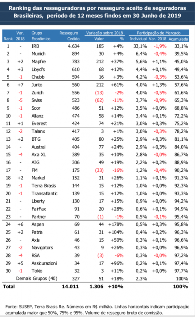 A participação de 43,9% do Brasil pode ser ainda decomposta em 33,1% referente ao IRB, que segue sendo líder isolado do mercado brasileiro e 10,8% referentes aos demais grupos econômicos com sede no Brasil (em 2018 este volume representava 8,8% do total). Desta maneira, o combinado de grupos econômicos com sede no Brasil, excluindo-se o IRB, aparece agora em quarto lugar (em 2018 ocupava o quinto lugar na lista), à frente de Suíça, França, Inglaterra, Espanha e Bermuda. Tal fato impressiona positivamente, principalmente por se tratar de um grupo jovem, com menos de 10 anos de existência, comentam os autores.