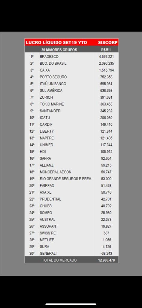 Seguradoras ligadas a bancos seguem liderando as três primeiras posições do ranking de lucro. A Bradesco Seguros segue sendo a líder do ranking, com R$ 4,5 bilhões, com uma participação de quase 30% no lucro do banco, que deve divulgar balanço do terceiro trimestre em breve. A BB Seguros vem em segundo lugar, com ganho de R$ 2,09 bilhões. A Caixa vem em terceiro, com R$ 1,5 bilhão. O Itaú caiu para quinto, com R$ 638 milhões, ultrapassado pela Porto Seguro, agora em quarto lugar no ranking, com lucro de R$ 725 milhões no período analisado pela Siscorp com base nos dados enviados à Susep.