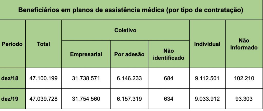 A Agência Nacional de Saúde Suplementar (ANS) disponibilizou nesta quarta-feira (05/02) os dados do setor de planos de saúde com os números referentes ao mês de dezembro de 2019. No período, o setor totalizou 47.039.728 beneficiários em planos de assistência médica em todo o Brasil, mantendo estabilidade em relação ao mesmo período de 2018.
