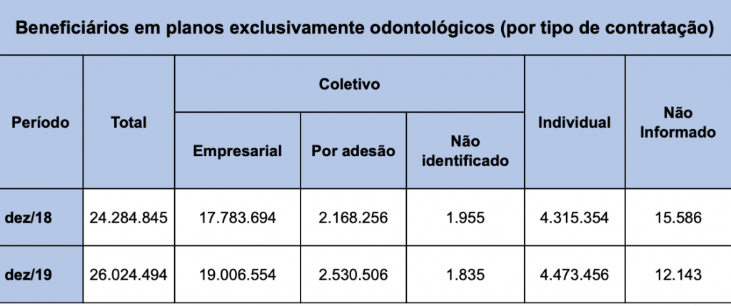 O segmento exclusivamente odontológico manteve trajetória de crescimento, contabilizando 26.024.494 usuários – expansão de 1.739.649 em relação a dezembro de 2018.
