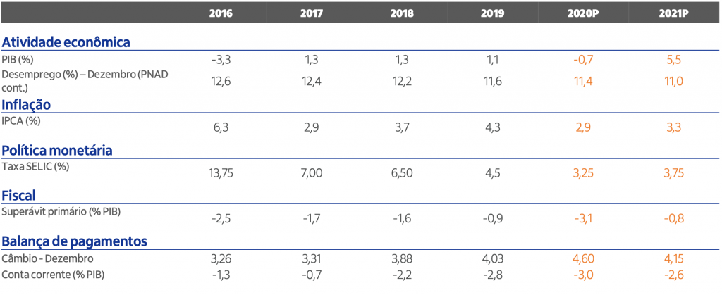 O Itaú BBA divulgou nesta manhã análise com as projeções dos principais indicadores econômicos para 2020 e 2021. Certamente que tudo pode mudar, mas por enquanto, a aposta para o Brasil é que o dólar fique em R$ 4,60 no término de 2020 e em R$ 4,15 em 2021. A Selic para 2020 é projetada em 3,25% ao ano e em 3,75% em 2021. O PIB de 2020 caiu de 1,8% que estava previsto para menos 0,7% na análise divulgada no dia 26 de março.