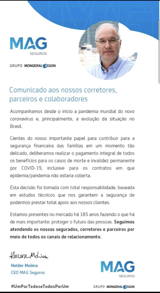 A MAG Seguros decidiu realizar o pagamento de todos os benéficos para clientes com Covid-19, inclusive para apólices que nao cobrem pandemias, informou Helder Molina, CEO do grupo, em nota no LinkedIn. Segundo ele, a decisão foi tomada com total responsabilidade, baseada em estudos técnicos, que atestam a solvência do grupo.