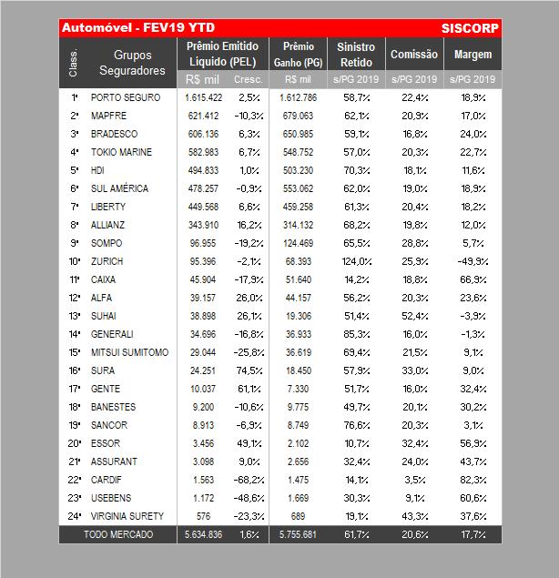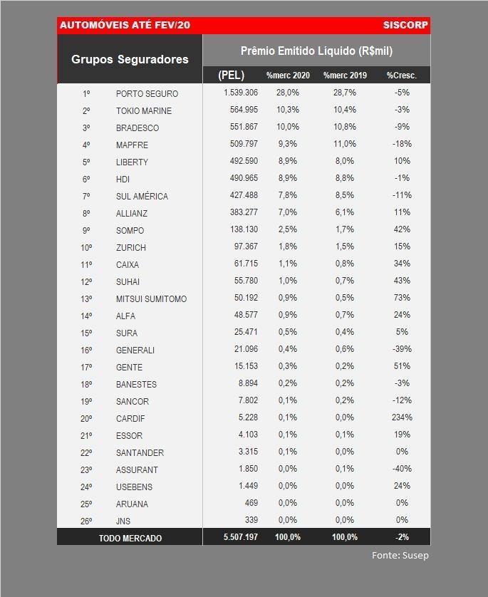 A disputa trouxe mudanças no ranking de auto do setor, segundo dados da consultoria Siscorp elaborados a partir do banco de dados estatísticos da Superintendência de Seguros Privados (Susep). A Porto Seguros segue na liderança absoluta, com R$ 1,5 bilhão em vendas no primeiro bimestre de 2020. O que lhe confere 28% de participação dos R$ 5,5 bilhões em prêmios arrecadados neste segmento. No mesmo período ao ano passado foram R$ 5,6 bilhões.
