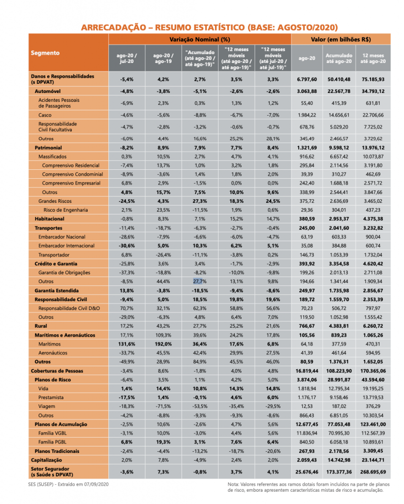 Em relação ao comportamento da sinistralidade comparada nos oito meses de 2019 e 2020, os números  revelam redução no segmento de Danos e Responsabilidades, de 53,4% para 48,8%,  em virtude da redução de acidentes e roubos no ramo de Automóveis. No ramo de Vida Risco, a sinistralidade agravou-se de 26% para 27,9%, dado o aumento dos óbitos e eventos de invalidez e doenças.