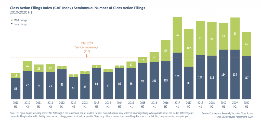 A atividade de reparação coletiva, particularmente nos EUA, continua sendo um risco chave para qualquer conselho de administração, embora os novos registros de ações de classe nos EUA tenham ficado cerca de 18% abaixo de 2019 durante o 1º semestre de 2020, de acordo com a Cornerstone Research. Isto é em grande parte devido à interrupção de negócios e da atividade judicial causada pela pandemia. No entanto, a freqüência dos processos judiciais está no caminho certo para igualar as taxas de 2017 e 2018 e será bem superior a cada ano anterior a esses. A porcentagem de novos pedidos em 2020 visando empresas americanas com sede no exterior tem sido quase o dobro da média nos últimos anos, com cerca da metade deles contra empresas asiáticas, inclusive na China e em Cingapura. Fora dos EUA, as ações de classe de valores mobiliários estão sendo apresentadas em números recorde e a ameaça de enfrentar uma ação aumentou em muitas jurisdições, como destacado em um recente relatório da AGCS e da Clyde & Co. O cenário para a reparação coletiva na Europa evoluiu nos últimos anos e a ação coletiva é uma exposição crescente.