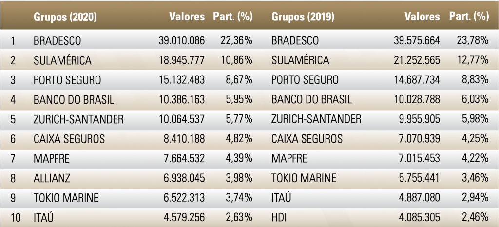 Segundo o Ranking, os cinco maiores grupos do setor em produtos de risco são Bradesco, SulAmérica, Porto Seguro, Banco do Brasil e Zurich Santander, que representam 54% de todo o mercado.