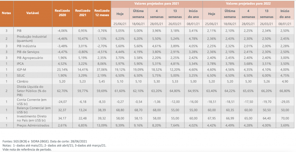 Simões destaca o Relatório Trimestral de Inflação do Banco Central, a Ata da última reunião do Copom e a reunião do Conselho Monetário Nacional, que manteve a meta de inflação em 3,50% e 3,25% para 2022 e 2023, respectivamente e estabeleceu meta de 3,00% em 2024, com bandas de 1,5p.p. de tolerância. O IPCA-15 registrou alta de 0,83% em junho. “A aceleração foi puxada principalmente por itens administrados, com destaque para a gasolina e para a energia elétrica, que deve continuar pressionada com o preocupante quadro hídrico”. Com isso, a projeção para o IPCA este ano subiu de 5,90% para 5,97%. Para 2022, a projeção para a inflação oficial permaneceu em 3,78% por mais uma semana, uma boa notícia para a autoridade monetária, já que é esta expectativa que estará diretamente associada ao objetivo de trazer a inflação de volta à meta no horizonte relevante”, diz.