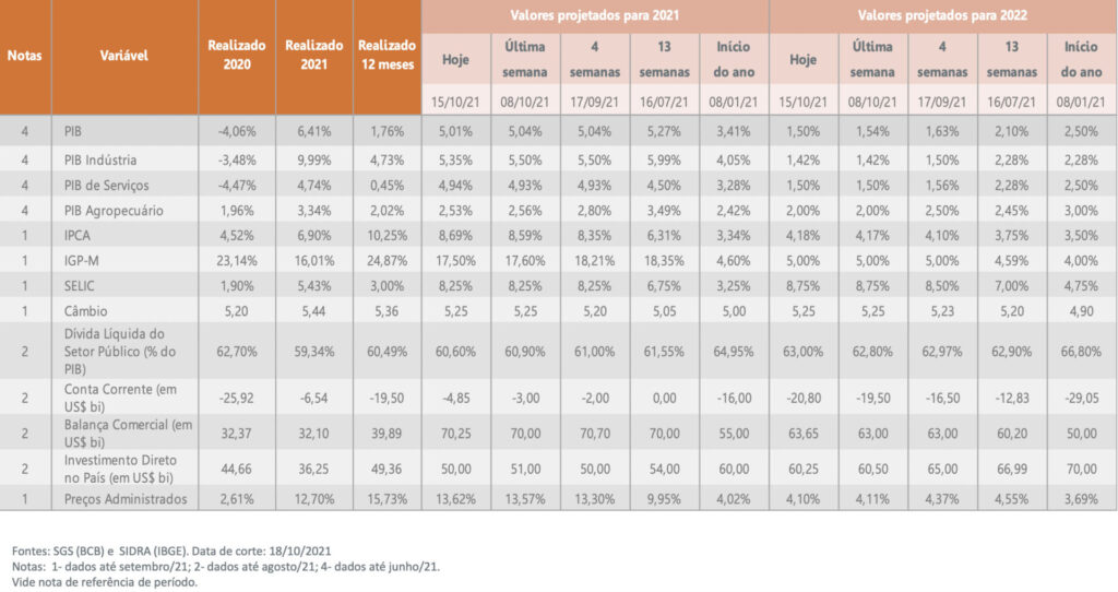Os analistas de mercado aumentaram pela 28ª semana consecutiva as projeções para o IPCA este ano, agora de 8,59% para 8,69% e voltaram a reduzir, na margem, a projeção para o PIB, que caiu de 5,04% para 5,01%. Para 2022, a previsão de expansão do PIB passou de 1,54% para 1,50%. Nesta semana, as discussões em torno dos precatórios priorizam a atenção dos agentes de mercados. “A PEC dos Precatórios, que está na Câmara, certamente está entre essas prioridades e deve ter o parecer de seu relator na Comissão Especial votado esta semana”, avalia Simões.