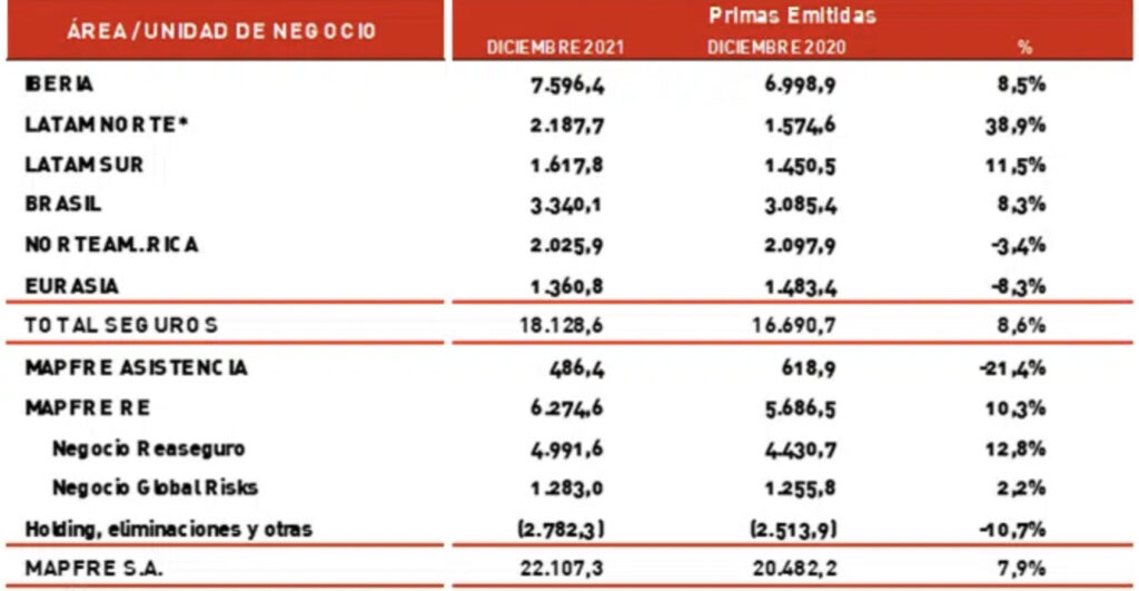 A MAPFRE também apresentou no Brasil um aumento significativo: cerca de 8,3% de crescimento em prêmios, num total de 3,34 bilhões de euros. “Esses dados mostram, mais uma vez, como o nosso modelo de negócios é sólido, mesmo em circunstâncias desafiadoras como as que temos enfrentado desde o começo da pandemia. Os dados do Brasil provam porque a companhia segue forte no País, permanecendo como a segunda maior operação da MAPFRE no mundo”, comenta Fernando Pérez-Serrabona, CEO da MAPFRE no Brasil.