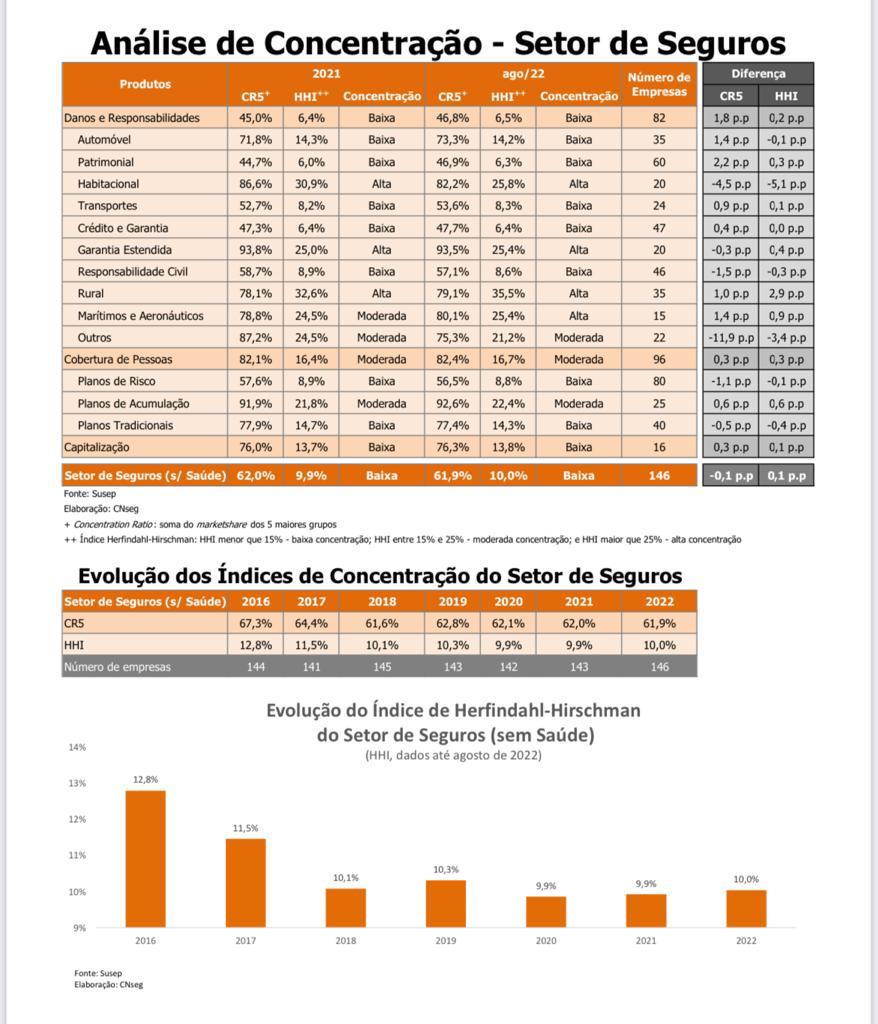 Pelas métricas do indicador HHI, o mesmo usado pelo Departamento de Justiça dos EUA, conclui-se que a maioria dos grupos de produtos do setor segurador nacional analisados apresenta baixa concentração e poucos têm níveis de concentração que podem ser considerados acima do padrão normal: Habitacional, Rural e Marítimos e Aeronáuticos, todos estes do segmento de Danos e Responsabilidades, com 82 seguradoras ofertando produtos aos clientes.