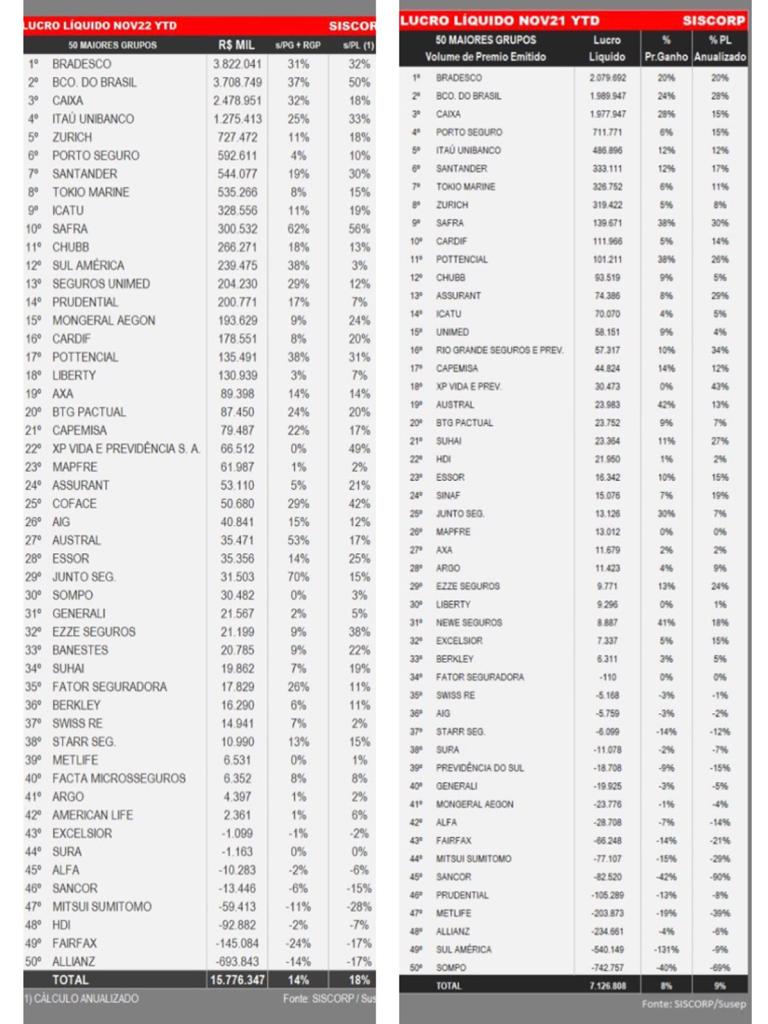 A Bradesco, que representou R$ 2 bilhões do lucro total até novembro de 2021, avançou para R$ 3,8 bilhões até novembro de 2022. O Banco do Brasil passou de R$ 1,98 bilhão para R$ 3,7 bilhões. A Caixa de R$ 1,97 bilhão para R$ R$ 2,4 bilhões. Somadas as três maiores que compõem o clube do bilhão, representam R$ 10 bilhões em ganho, restando cerca de R$ 5,7 bilhões para as outras 50 seguradoras ativas no país.