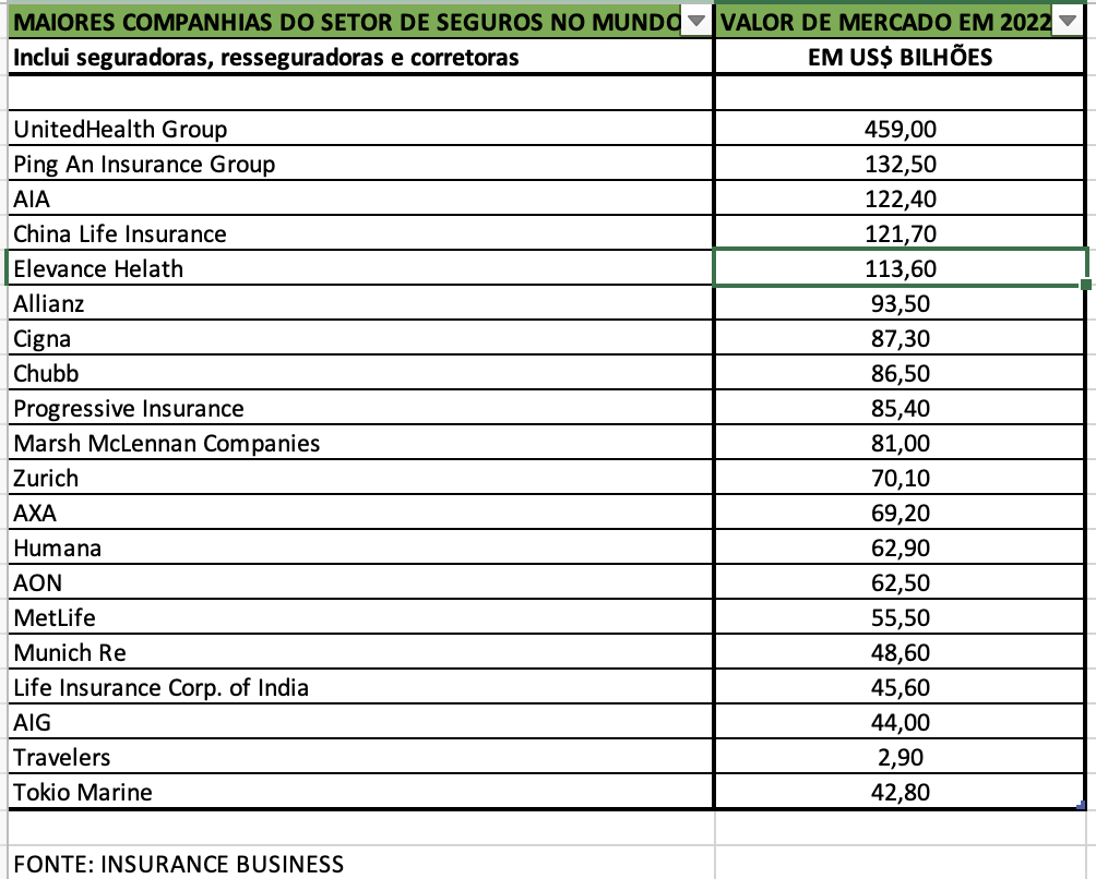 Neste artigo, a Insurance Business classifica as 20 maiores seguradoras do mundo com base no valor de mercado. Essas empresas respondem por quase dois terços, ou cerca de US$ 1,93 trilhão, do valor global, em 2022.